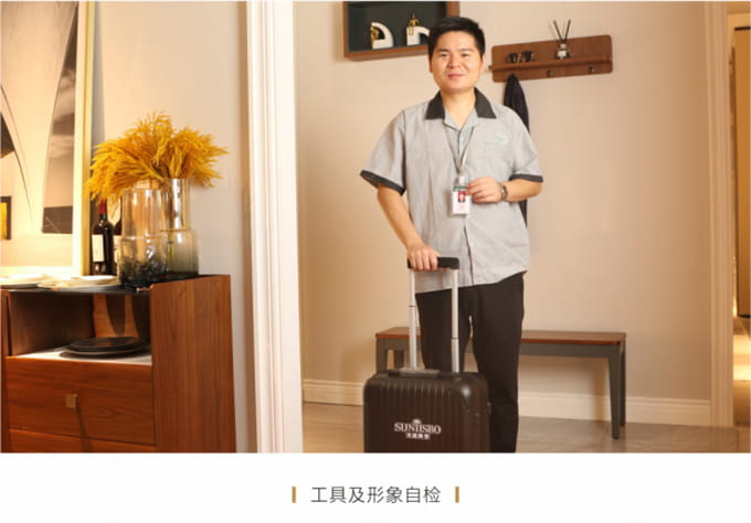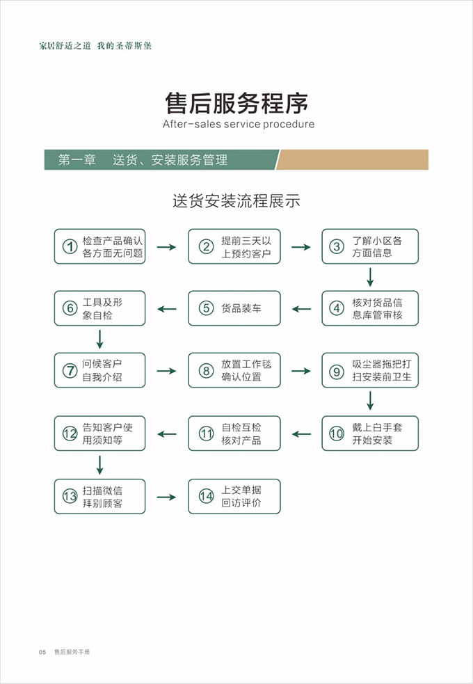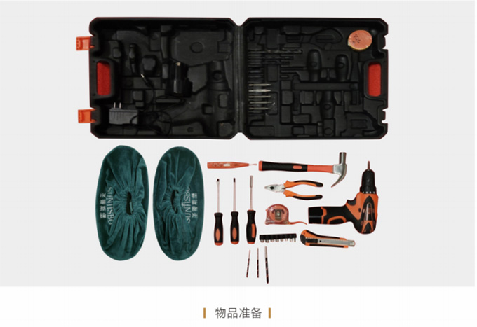 物資準備:上門前必須著圣蒂斯堡統一工作服,佩戴工作證,準備好安裝工具、搬抬工具(搬運背帶等)、備件、筆記本、手套、鞋套、地墊、衛生清掃工具(清潔劑、抹布、掃把簸箕、拖把、吸塵器等)、瓶裝水、《圣蒂斯堡安裝施工指示牌》、收據和圣蒂斯堡產品說明書、《產品配送單》和《配送滿意度調查表》等物品。再帶上小禮品,例:鮮花或碳包去味禮包等。