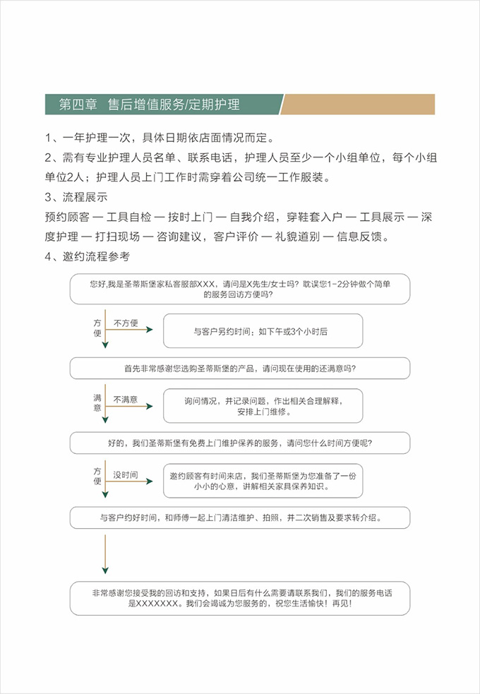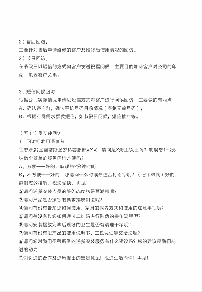 話術參考:“**先生/女士您好,我是圣蒂斯堡的售后服務人員**,您購買的圣蒂斯堡家具已經全部到貨了,送貨安裝大約需要**時間,請問您這邊什么時候方便我們上門送貨安裝呢?”同時要了解送貨小區的電梯、樓道、入戶門的尺寸等,提前做好準備,避免意外情況。最后確定送貨時間(安裝所需要時長),并告知客戶安裝人員的相關信息,可加微信發送,并發送配送安裝流程說明。