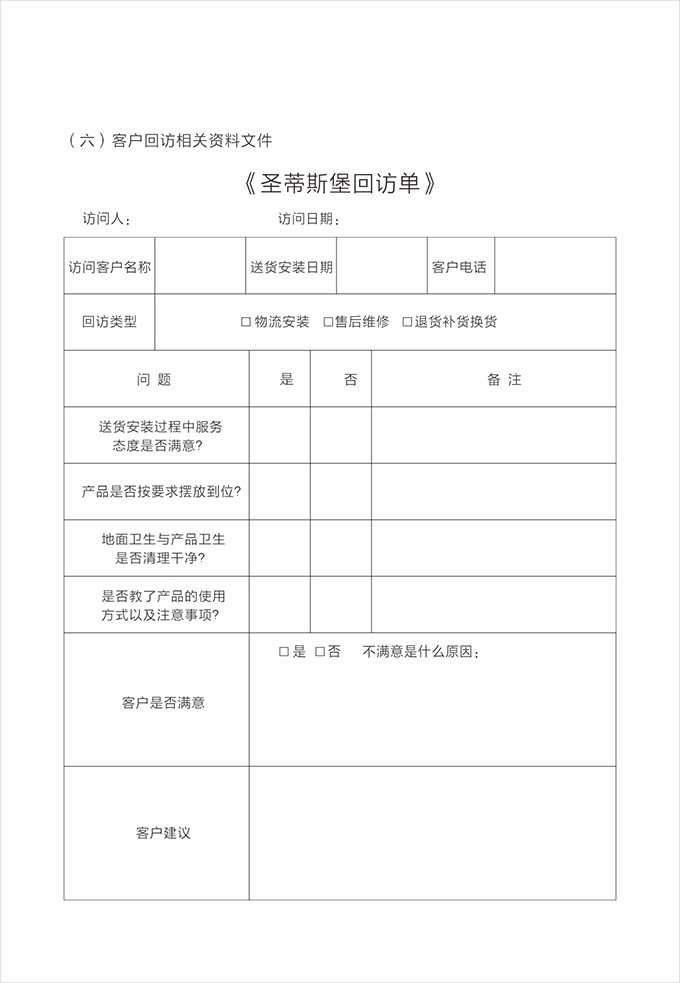 告別之前:告知客戶圣蒂斯堡全國免費服務電話(售后服務貼)以及保修方式,請客戶在《產品配送單》上簽名,并填寫《配送滿意度調查表》后,合影留念。