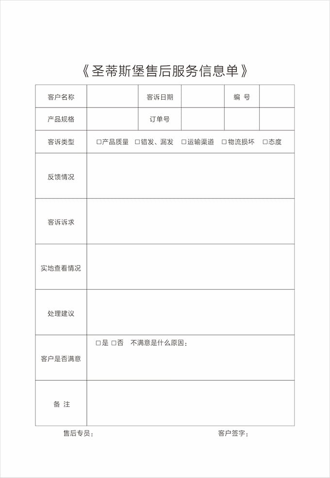 現場修復完成后,請客戶確認,在《圣蒂斯堡售后服務信息單》上簽字;不能現場修復時則必須跟客戶說明清楚,征得客戶同意后將產品帶回處理或返廠處理,應開具相關收據交予顧客,并且登記備案;修理完畢后按照配送流程送到顧客家后應向顧客索回收據,并且請顧客在《圣蒂斯堡售后服務信息單》簽字。
