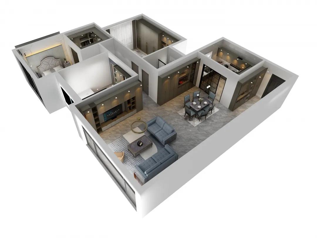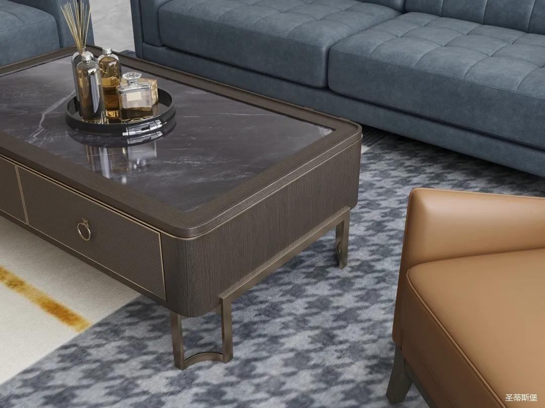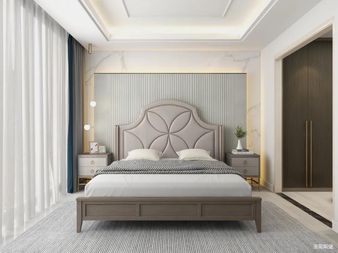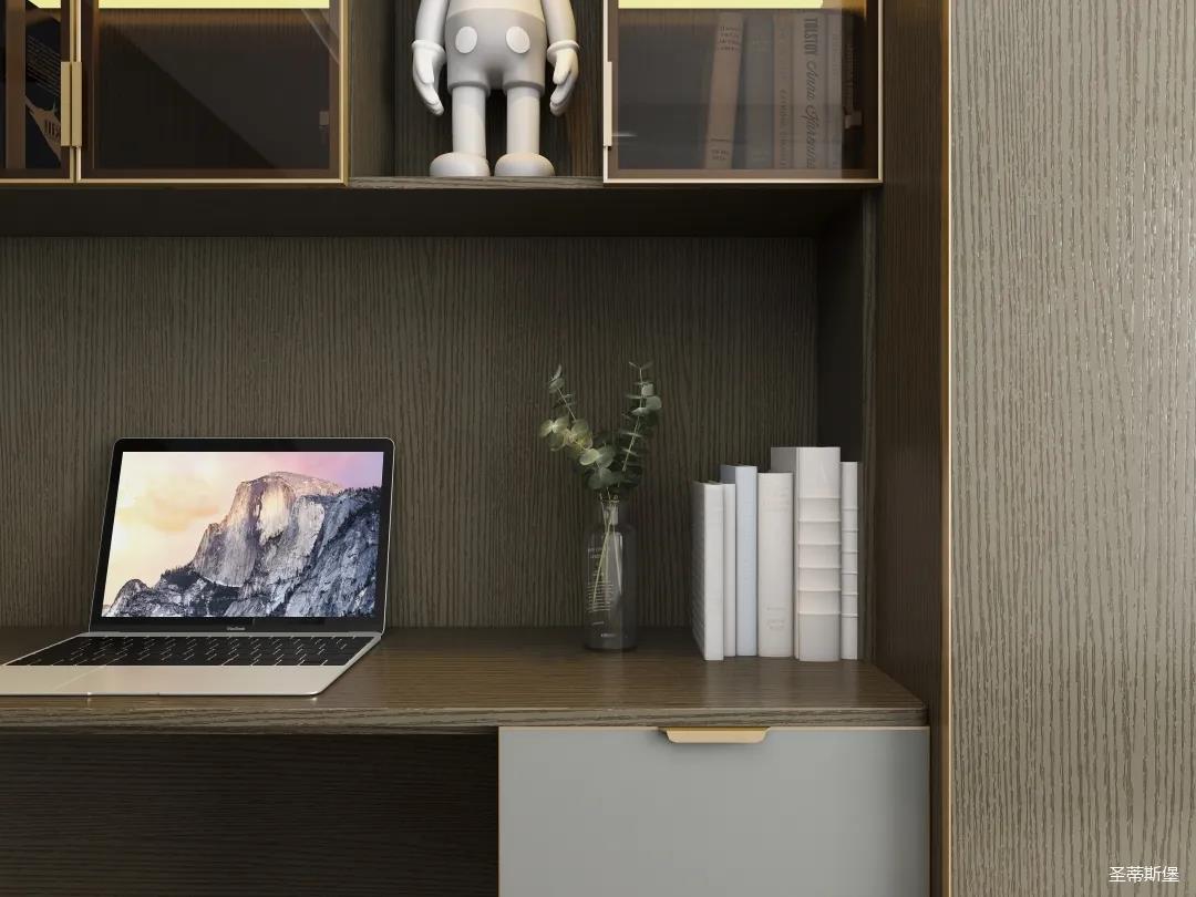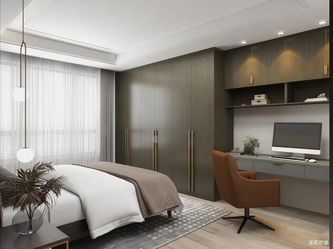 材質的交替與光影的變換,具有濃濃的現代簡奢色彩。獨一無二的英倫爵士灰定制柜,由延邊鑲嵌的香檳金拉絲金屬分割,線條流暢且奢華,不僅代表著時尚,也崇尚了實木韻味。設計師將現代、實用、精致的藝術設計風格應用其中,更是精致生活方式的藝術演繹。在平靜的空間中表現出獨特的藝術骨感,滿足我們對精致生活的精神追求。