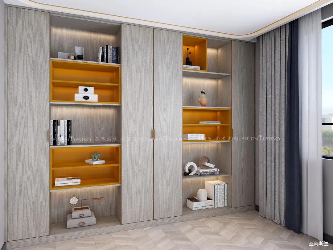 英倫仿古灰實木嵌墻書柜,結合同色系的時尚簡約書桌,整個空間都被自然氣息包圍。由于工作原因,加班也成為了生活中的常態,簡約書房設計打破了平時忙碌的生活,也為心中尋得那一方心靜之地。