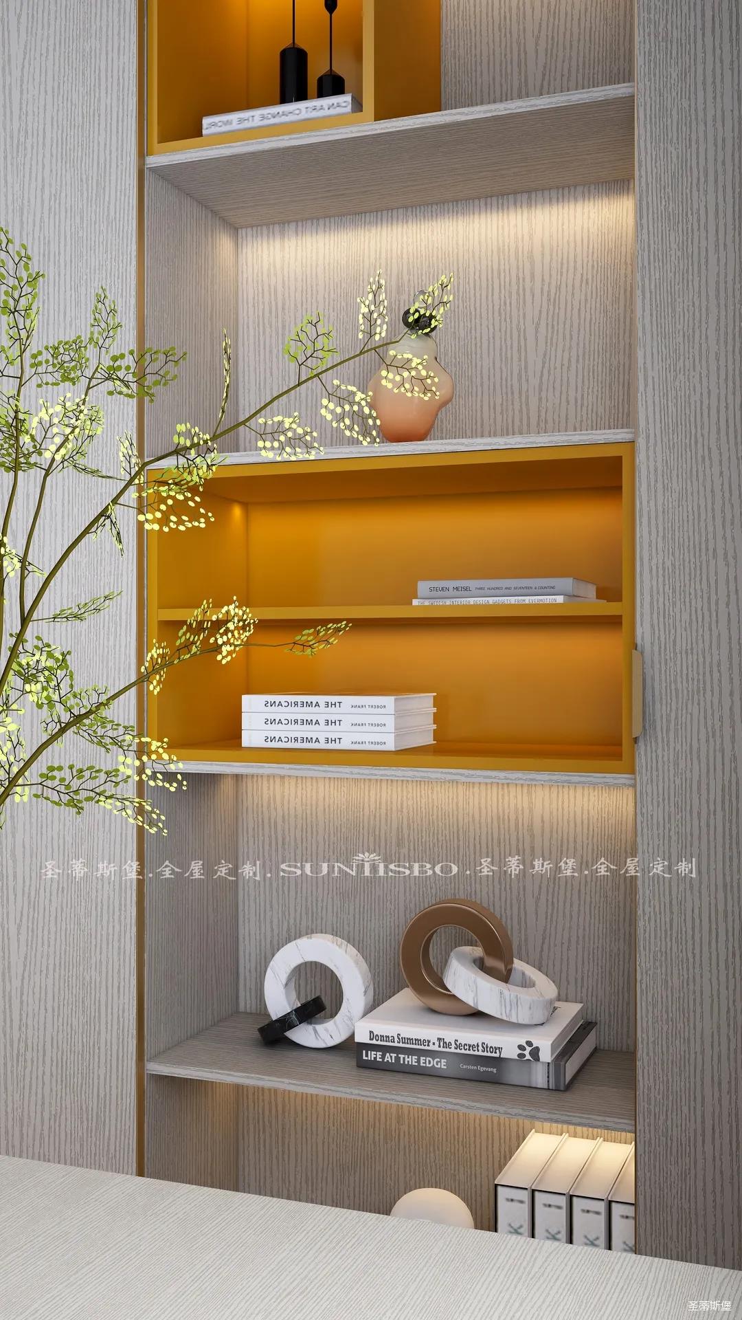 書柜點綴著適當的愛馬仕橙,除了自身攜帶的高貴氣質,在聚焦視線的同時,還明確了收納分區。