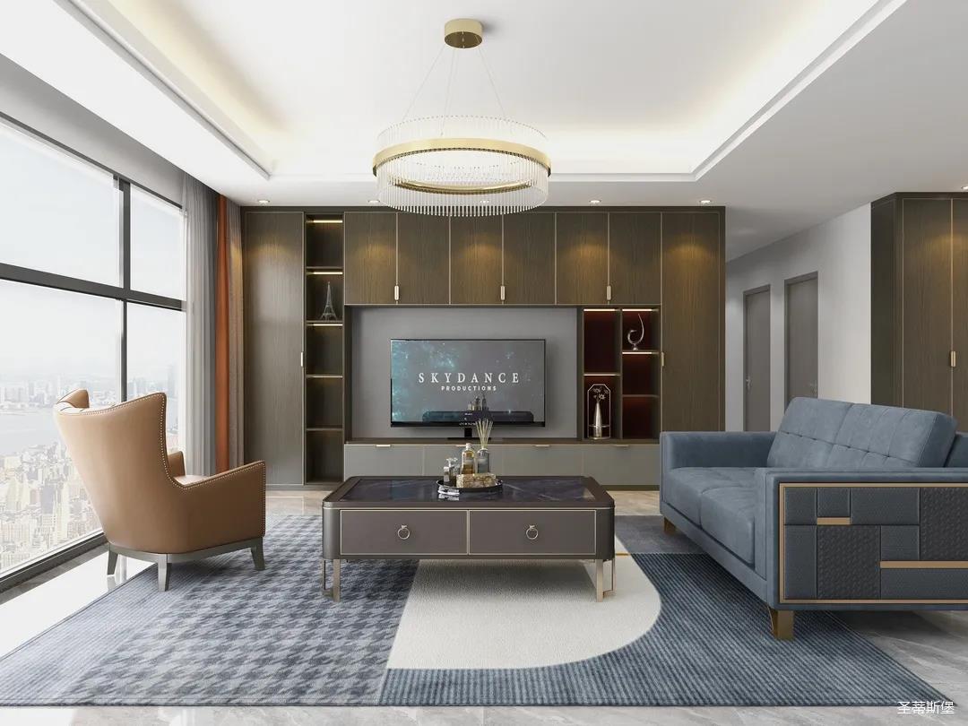 它以英倫爵士灰為柜體主調(diào),背景墻定制了整墻的儲物柜,色調(diào)懷舊復(fù)古的同時還夾帶著時尚摩登氣息,明暗收納合理分區(qū),電視被實木飾面包圍,使空間視覺得以延伸,美觀收納兩不誤。