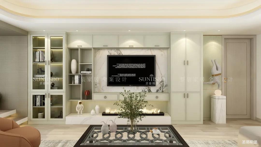 電視墻在客廳除了承擔(dān)著整體美觀之外,在小戶型的收納上也能承擔(dān)一些其他功能,比如小戶型收納問題。如果你家有強烈收納需求,可以選擇定制柜體墻面,做成整墻收納柜體,安裝無拉手柜面,既滿足了日常收納需求,也融合了美觀的裝飾效果。
